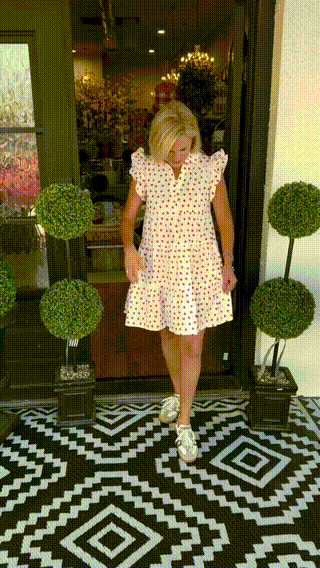 The dress in bright white dotted with cheerful orange spots brings a playful pop of color to your wardrobe. Its lively pattern adds a fun, fresh vibe perfect for sunny days and casual outings. Embrace effortless style with this charming dress that’s as spirited as you are.